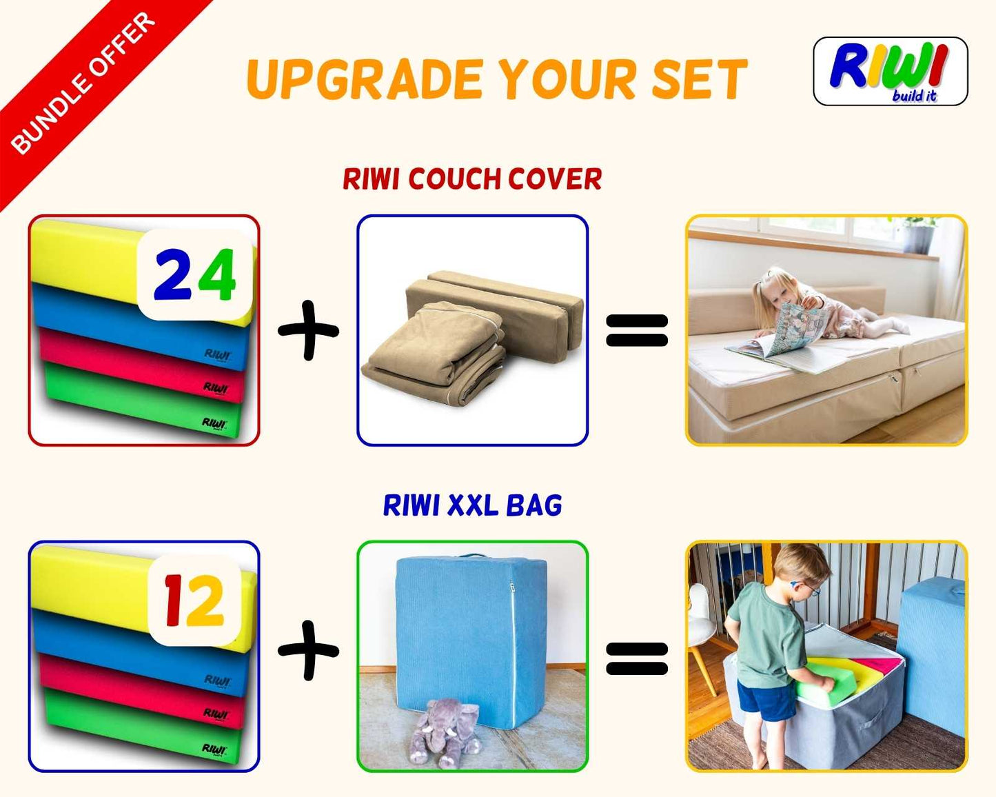 For mini blocks: The RIWI mini Bag transforms 24 mini blocks into a compact play stool. Great for storage, transport, or a space-saving seat in the kids' room.