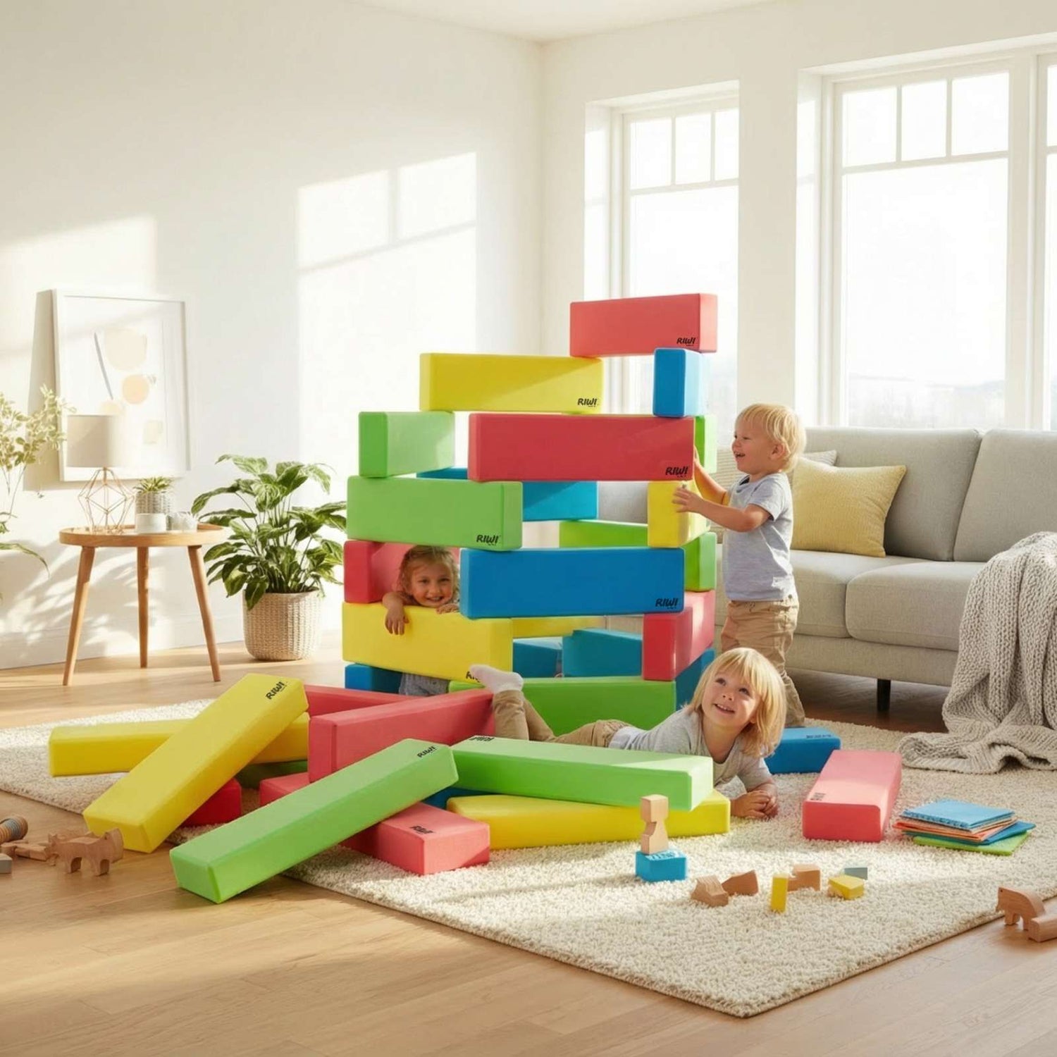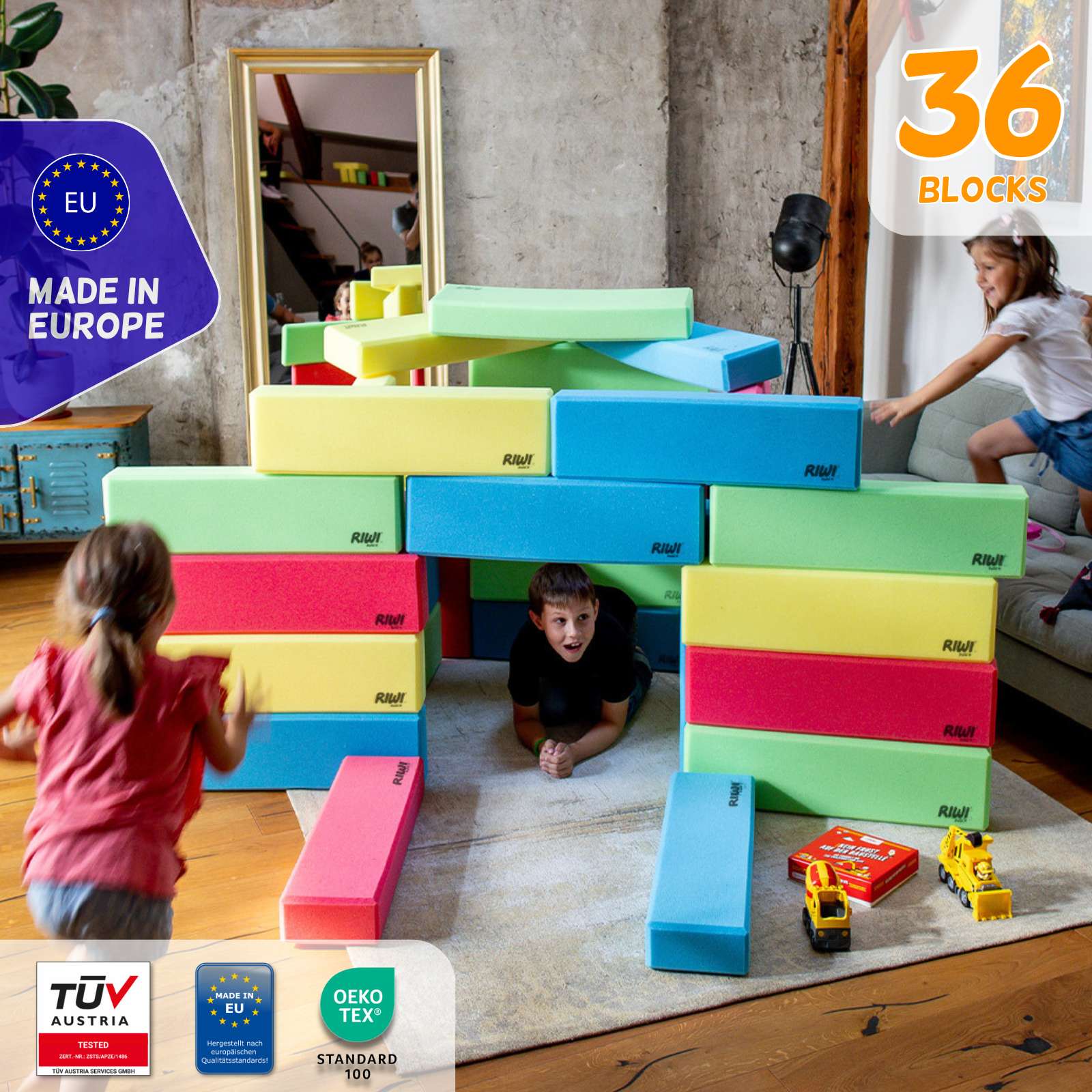 Bloques de espuma gigantes para niños desde los 3 años. Para construir, jugar y crear – dentro y fuera de casa.