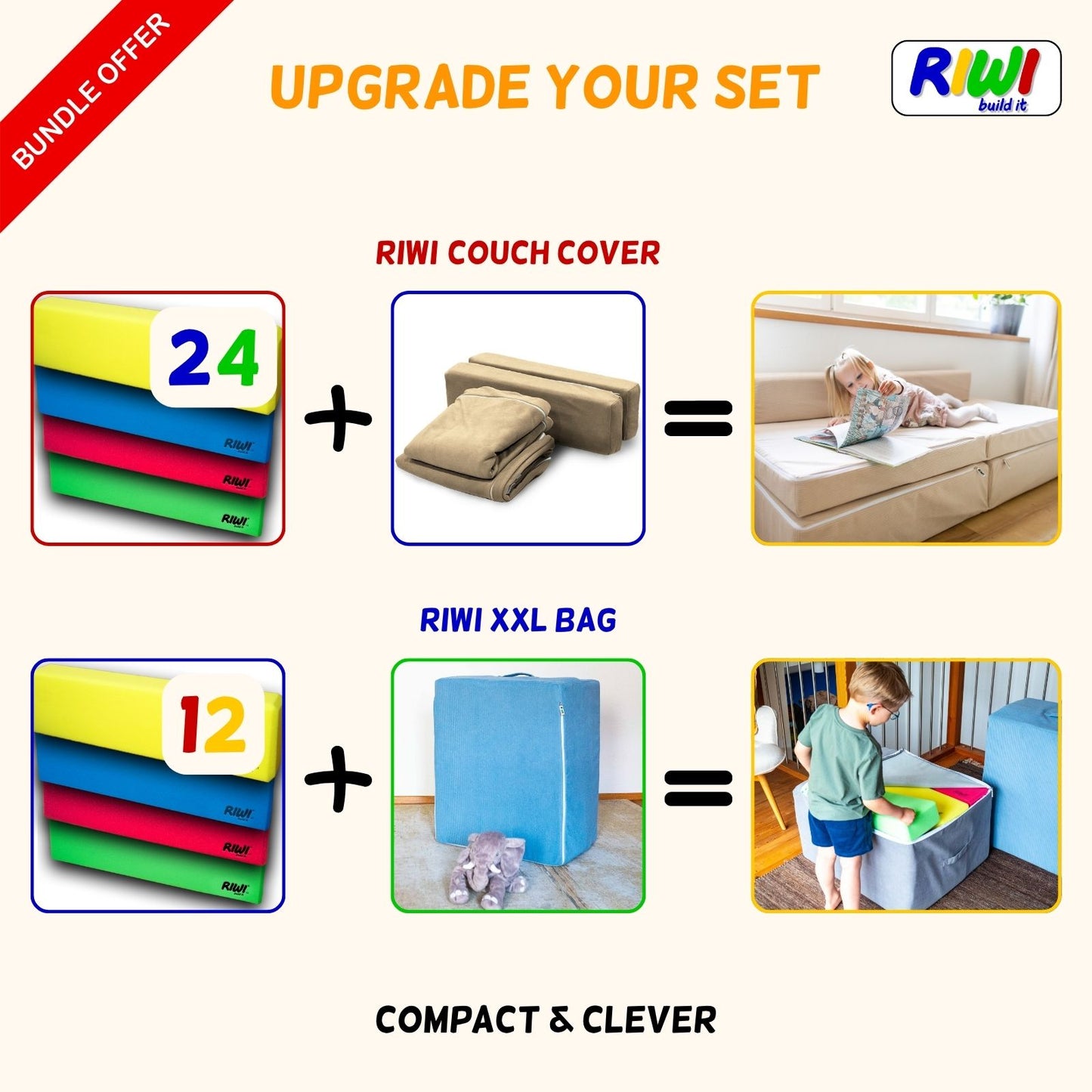 Pour les blocs mini : Le RIWI mini Bag transforme 24 blocs mini en un tabouret de jeu compact. Parfait pour le transport, le rangement ou comme siège dans la chambre d’enfant.